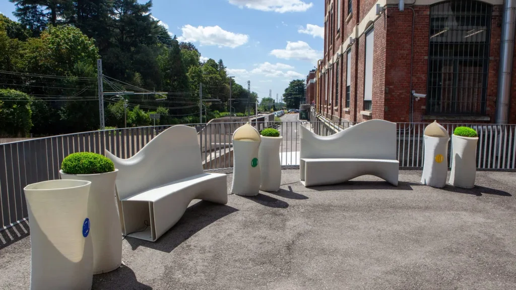 Otro objetivo era crear un entorno para fomentar la inclusión y las interacciones sociales dentro de la ubicación identificada en las instalaciones de ComoNExT. Los muebles fueron diseñados con formas orgánicas y dispuestos en semicírculo, también incluyeron elementos IoT para permitir funciones inteligentes para la instalación. Por ejemplo, los floreros permiten introducir plantas que se riegan automáticamente con sensores inteligentes y los contenedores de reciclaje facilitan la gestión de residuos, todo ello alimentado a través de energía solar.