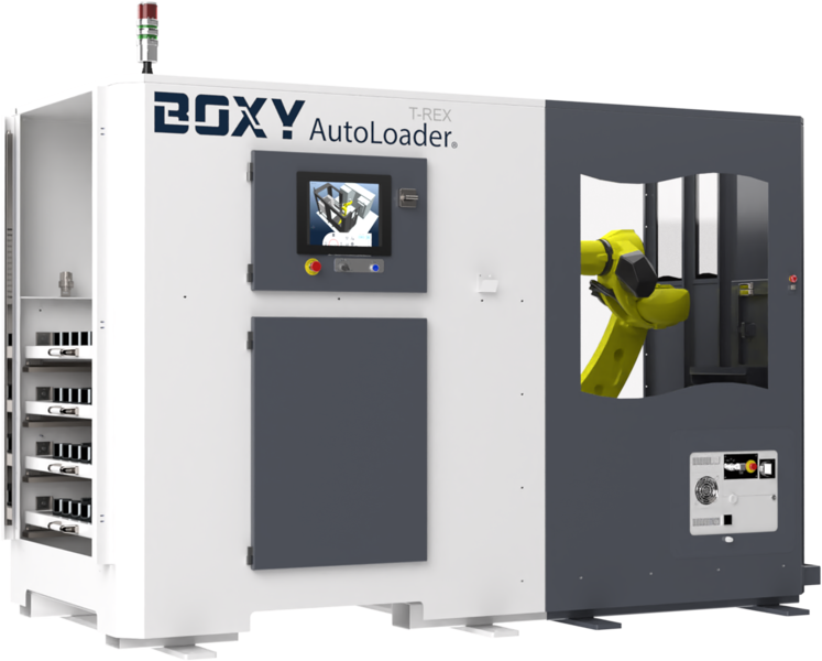El sistema de automatización con robot Boxy Autoloader T-REX para máquinas de control numérico CNC ofrece la solución ideal para aplicaciones de mecanizado con maquinaria de alta precisión y productividad, con largas jornadas de trabajo sin personal.